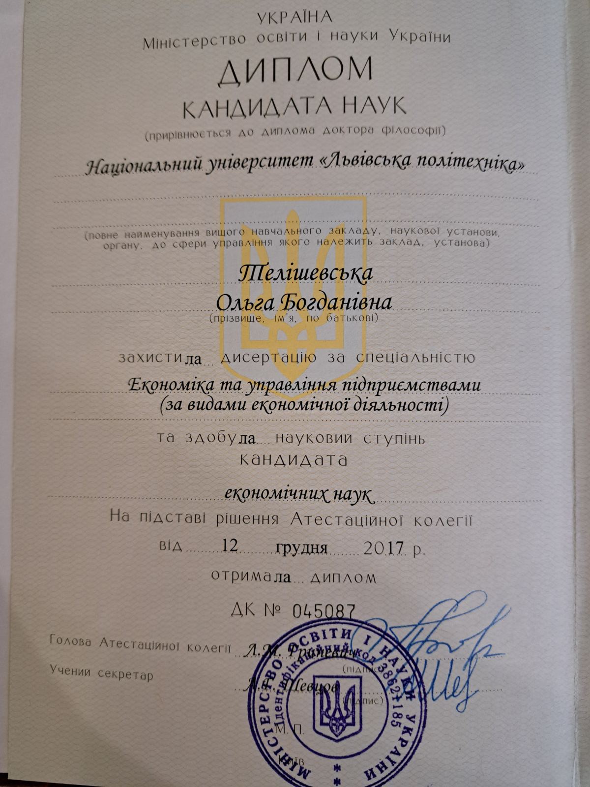 Адвокат, кандидат економічних наук, доктор філософії Ph.D.